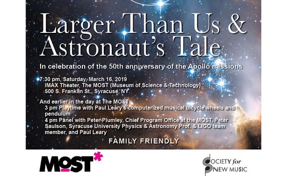 Creating a space where music and science can exist in perfect harmony, the Society for New Music is premiering “Larger Than Us” and performing “The Astronaut’s Tale” on Sunday, Jan 20 from 4.30 pm -6pm at the MOST, Armory Square, Downtown Syracuse.