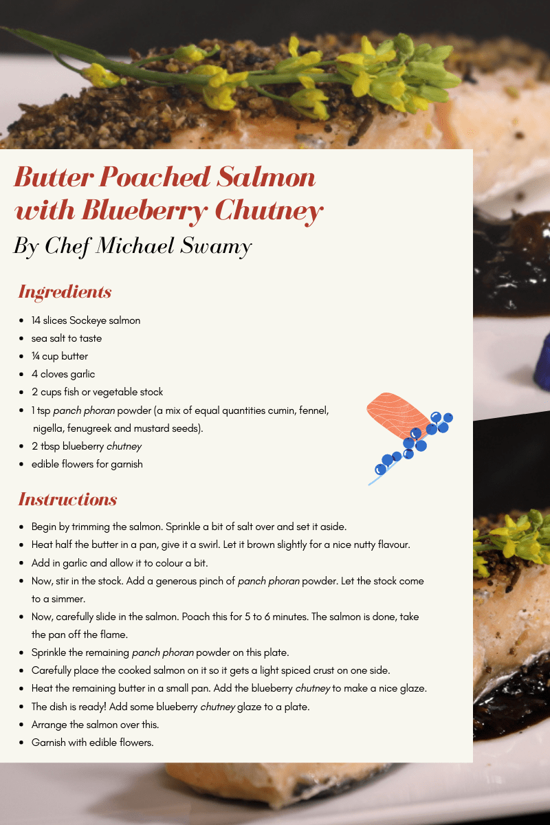 menu Salmon with Blueberry Chutney Image and recipe courtesy: Chef Michael Swamy Date: June 2, 2021Author: Lyle Michael
