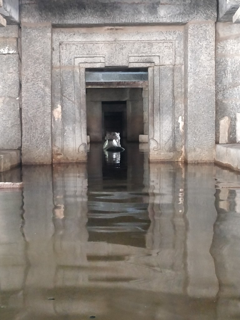 The sense of serenity carried forth in the last place we visited, a marvel, shrouded in a little enigma. The Prasanna Virupaksha or the Underground Shiva Temple stands a few feet below ground level with the inner sanctum always filled with water. Devotees wade through the stagnant pool to seek blessings from Lord Shiva who sits in the austere dark shrine. They say this temple was built as convenience for its proximity to the royal dwellings in the 14th century making it one of the oldest temples in Hampi, but it is one of the many floating theories to its enigmatic origin.