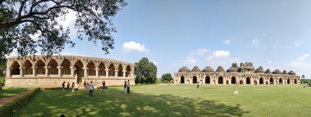 While the Queen’s Bath, with an outdoor pool, is colossal – an example of the ornate lifestyle of the royals – the stepped tanks in the Royal Enclosure – one for the royals and the other for the public – are architecturally impressive with steps leading down like an inverted pyramid. The Royal Enclosure placed us in a scene from Bahubali where the royals sat atop a platform and addressed the army or relished the recreational activities that played out before them. The Mahanavami (Dasara) Dibba greets you first when you enter – the king’s platform that’s three levels high constructed during the reign of King Krishnadevaraya. The grandeur that once was doesn’t escape us as we move along to the Lotus Mahal, a segregated spot for the royal women to retreat to. The shape of the central dome renders the mahal its name, also seen in the passages and walls that surround it. Tranquil and beautiful, the place makes you want to relax on the green lawns which you can do before getting those well-framed shots of the expansive elephant stables next door. Domed structures all in a row carry tales of the royal elephants that once inhabited these walls while lilies sit pretty on the lawns facing them. Like we said, tranquil.