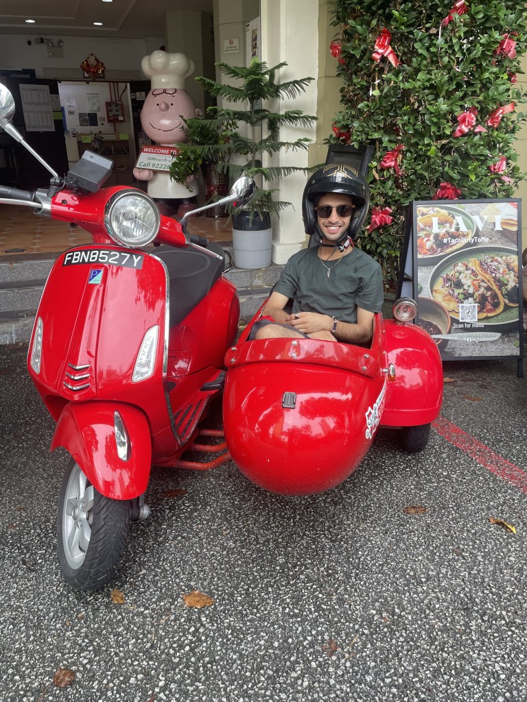 Post such an indulgence, a ride around town in a Vespa sounds like just the thing the doctor ordered! So, I set off, in my chosen colour, helmet on, to discover more of Singapore via sidecar, courtesy Singapore Sidecars. What a thrill, right from the rider, nay ‘storyteller’, waiting for me at the hotel to discovering spots like an art, culture and music house upon a hill to playing mini celebrities, having my photograph clicked with other riders as we queued up in our multihued army of rider and pillion. Founded by Simon Wong, by chance, Singapore Sidecars has gone on to win world records and earned credit for riding stars like Emma Raducanu and Benedict Cumberbatch around Singapore! And Simon aims proceeds of these vintage rides to the field of cancer research, after he lost his wife to the disease, at a young age.